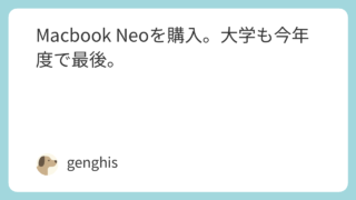 日記 Macbook Neoを購入。大学も今年度で最後。 普通に日記を書くのも久しぶりです。最近書いた記事は3月の振り返りですね。パソコン、届きましたパソコンが届きました。Macbook Neo 512GBモデルです。パソコンの箱。見た目がとても良い。このパソコンを選んだ動機は色です。私は文系大学... 2026.04.04 日記