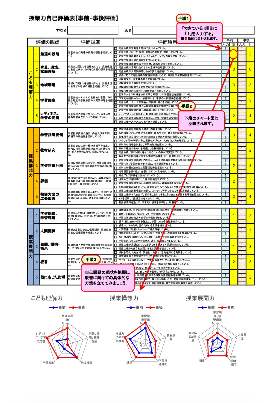 自己評価に関してはこの事前・事後評価をこのような数値形式で行い、観察者による評価は事後のみに行うとちょうどいいでしょう。